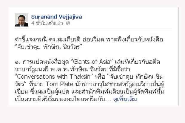 นายสุรนันทน์ เวชชาชีวะ เลขาธิการนายกรัฐมนตรี โพสต์คำชี้แจงกรณี ดร.สมเกียรติ อ่อนวิมล พาดพิงเกี่ยวกับหนังสือ “จับเข่าคุย ทักษิณ ชินวัตร” ผ่านเฟสบุ๊คส่วนตัว ว่า