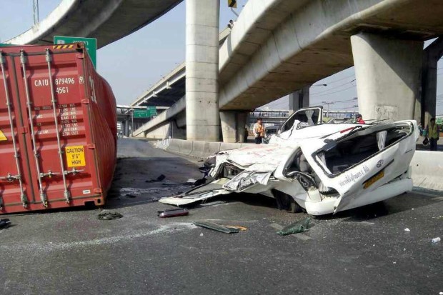 คอนเทนเนอร์ตกทางยกระดับทับรถตู้