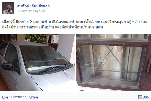 สมศักดิ์ เจียมธีรสกุล โพสต์เฟซบุ๊ก ถูกคนร้าย ยิง-ปาก้อนอิฐใส่รถ-บ้าน ขณะเจ้าตัวอยู่ในบ้าน