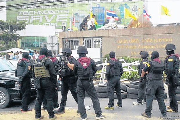 แต่เมื่อถามซ้ำถึงภาพจากพื้นที่ ปตท. โฆษกตำรวจก็ยอมรับว่า เพิ่งได้เห็นภาพที่หน้าโรงเรียนหอวัง และภาพนั้นน่าจะเป็นกลุ่มตำรวจอย่างชัดเจน แต่เข้ามาปฏิบัติหน้าที่เฉพาะกิจในลักษณะนอกเครื่องแบบ และไม่มีอะไรที่เกินเลยแน่นอน เพียงแต่น่าจะเป็นการคุมพื้นที่หลังมีการขอคืนพื้นที่จากกลุ่มผู้ชุมนุมที่หน้ากระทรวงพลังงาน