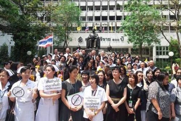เมื่อวันที่ 26 ก.พ. เวลา 12.00 น.ที่ลานพระราชานุสาวรีย์ สมเด็จพระมหิตลาธิเบศร อดุลยเดชวิกรม พระบรมราชชนก โรงพยาบาลศิริราช กลุ่มแพทย์ พยาบาล และบุคลากร รพ.ศิริราช ได้ออกมารวมตัวกัน เพื่อแสดงจุดยืนร่วมกับเครือข่ายบุคลากรทางการแพทย์และสาธารณสุข โดยมี นพ.วิศิษฎ์ วามวาณิช ผู้อำนวยการ รพ.ศิริราช นำอ่านแถลงการณ์เรื่องประนามการใช้ความรุนแรงทางการเมือง และต่อต้านรัฐบาลโกงประชาชน