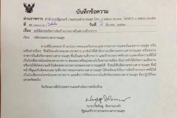 รมว.สาธารณสุขส่งบันทึกข้อความถึงปลัดสธ. สั่งให้เคร่งครัดเรื่องการติดป้ายต้านรัฐบาลโกง อ้างไม่เป็นประโยชน์ต่อทางราชการ-ส่อเจตนามุ่งเรื่องการเมือง
