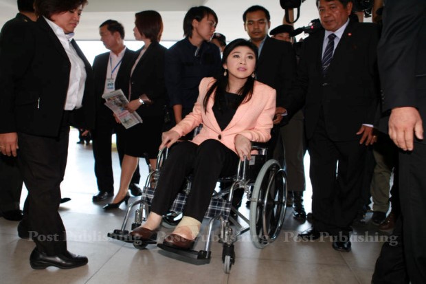 หลังจากนั้นวันที่ 17 มี.ค. น.ส.ยิ่งลักษณ์ ก็ปรากฎตัวต่อสาธารณชนด้วยอาการเดินขากะเผลก การประชุมคณะรัฐมนตรีวันที่ 18 มี.ค. ถึงขั้นต้องนั่งรถเข็นเข้าประชุมเลยทีเดียว