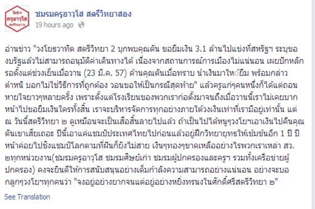 "ถ้าเป็นไปได้หนูๆวงโยฯเอาเงินไปคืนคุณตันเขาเสียเถอะ ปีนี้เอาแค่แชมป์ประเทศไทยไปก่อนแล้วอยู่ฝึกวิทยายุทธให้เข้มข้นอีก 1 ปี ปีหน้าค่อยไปชิงแชมป์โลกตามที่ฝันก็ยังไม่สาย เงินๆทองๆขาดเหลืออย่างไรพวกเราเหล่า สว.2ทุกหน่วยงาน(ชมรมครูอาวุโส ชมรมศิษย์เก่า ชมรมผู้ปกครองและครูฯ รวมทั้งเครือข่ายผู้ปกครอง) คงจะยินดีให้การสนับสนุนอย่างเต็มกำลังความสามารถอย่างแน่นอน อย่างจะบอกลูกๆวงโยฯทุกคนว่า "จงอยู่อย่างยากจนแต่อยู่อย่างหยิ่งทรนงในศักดิ์ศรีสตรีวิทยา 2"ชมรมครูอาวุโส สตรีวิทยาสองระบุ