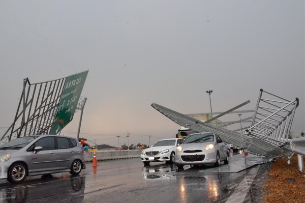 ลมพายุพัดป้ายหล่นทับเก๋งบนมอเตอร์เวย์