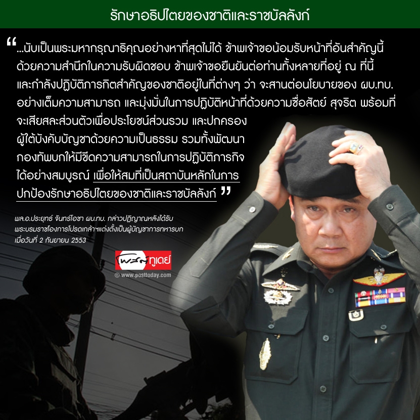 พล.อ.ประยุทธ์ จันทร์โอชา ผบ.ทบ. กล่าวปฏิญาณหลังได้รับพระบรมราชโองการโปรดเกล้าฯแต่งตั้งเป็นผู้บัญชาการทหารบก เมื่อวันที่ 2 กันยายน 2553