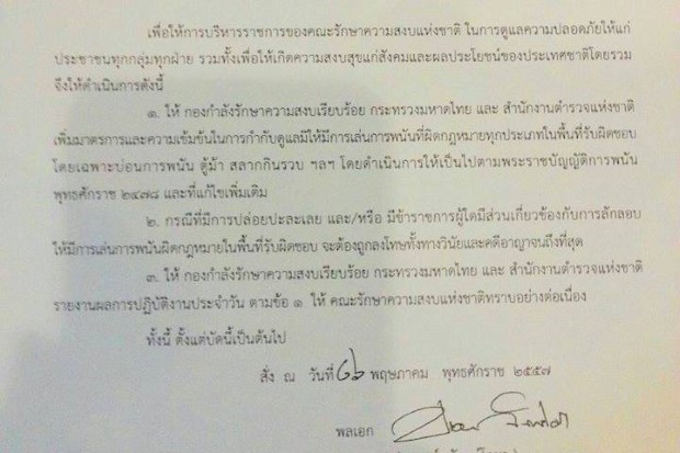 เมื่อวันที่ 27 พ.ค. คณะรักษาความสงบแห่งชาติ (คสช.) มีคำสั่ง ที่ 24/2557 เรื่อง ห้ามให้มีการเล่นการพนันที่ผิดกฎหมาย โดยมีเนื้อหาดังนี้
