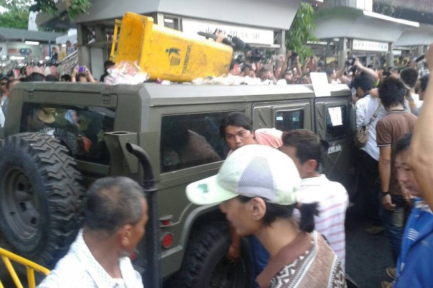 ขณะที่ทหารได้พยายามเคลื่อนรถคันดังกล่าวออกจากที่เกิดเหตุ โดยสามารถนำรถออกไปได้ 2 คัน เหลือ 1 คันติดอยู่ในวงล้อมผู้ชุมนุม ซึ่งผู้ชุมนุม ได้ปล่อยลมยางรถทั้งสี่ล้อ พร้อมนำขวดน้ำ ป้ายข้อความต่อต้าน ถังขยะ และกางเกงใน พาดกองอยู่บนรถ พร้อมพ่นสีสเปรย์ถ้อยคำต่างๆบนรถ จนในที่สุดเจ้าหน้าที่ต้องนำรถยกเข้ามานำรถคันดังกล่าวออกไป โดยมีเจ้าหน้าที่ตำรวจ ตั้งแนวล้อมรถเพื่อกันผู้ชุมนุมออกไ
