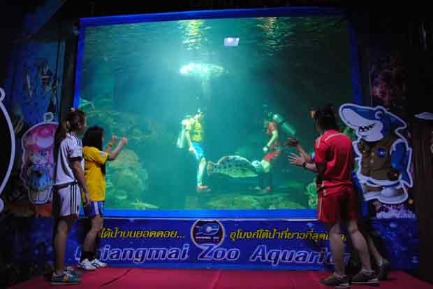เมื่อวันที่11มิ.ย.57 ที่เชียงใหม่ ซู อควาเรียม สวนสัตว์เชียงใหม่ นายนิพนธ์ วิชัยรัตน์ ผู้ช่วยผู้อำนวยการสวนสัตว์ พร้อมนายนฤทัต เจริญเศรษฐศิลป ผู้บริหาร จัดแสดงโชว์การเตะบอลใต้น้ำ จัดไฮไลท์สุดพิเศษ ศึกลูกหนังใต้ท้องทะเลบนยอดดอย ที่มีนักประดาน้ำลงมาแสดงความสามารถเตะบอลในน้ำให้ชมกัน ในอุโมงค์น้ำเค็มที่นักดำน้ำก็เป็นนักฟุตบอลเล่นบอลจริงๆ สวมชุดฟุตบอลประเทศที่เข้าร่วมแข่งขันฟุตบอลโลก และ ใส่รองเท้าสตั๊ด ถุงเท้ายาว โดยเฉพาะชุดทีมแซมบ้า บราซิลเจ้าภาพ โชว์การเดาะบอลลีลาสวยงาม ไม่แพ้กันกับทีมสเปน ออกมาโชว์ลีลาเตะเดาะบอลได้ไม่ยิ่งหย่อนกัน การเตะบอลให้กันไปมาได้เหมือนบนสนามจริงๆ แต่ในน้ำใช้ความสามารถเป็นพิเศษเพราะยากกว่าบนพื้นดินเป็นหลายเท่า ที่คอนโทรลบอลให้ได้เหมือนพื้นดิน