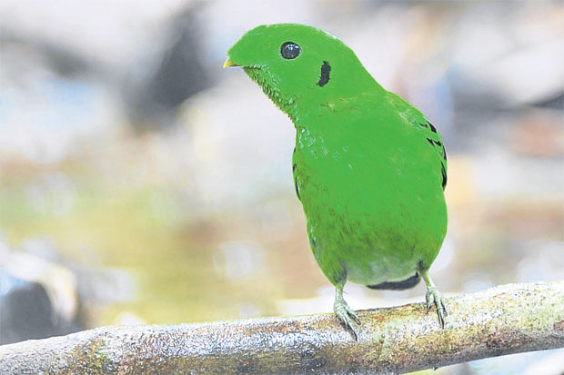 ตอนนั้นประมาณเที่ยงวัน ผมได้ยินเสียงร้องพิลึกๆ ของนกเขียวปากงุ้ม (Green Broadbill)