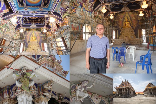 นาทีนี้ สุรินทร์ ภาณุมาศ ประติมากร ผู้ควบคุมการสร้างสรรค์งานศิลปะภายในพระอุโบสถ ยืนกอดอกยิ้มกว้างอย่างภาคภูมิใจ