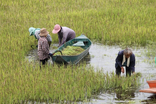 ชาวนาอยุธยาลงแขกเกี่ยวข้าวหนีน้ำท่วม