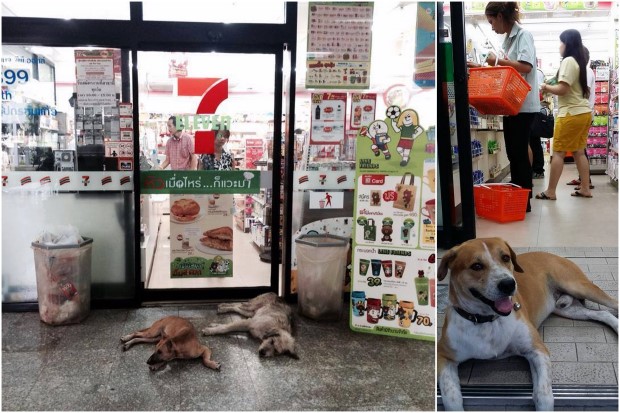 เแสงไฟสว่างจ้า แอร์เย็นฉ่ำ คนใจดีนิยมหยิบโยนอาหารให้ จึงไม่น่าแปลกใจที่เหล่าสุนัขทั้งหลายจะพากันมาปักหลักยึดพื้นที่บริเวณหน้าร้านสะดวกซื้อ สร้าง “แลนมาร์ค”เพื่อเป็นที่หลับนอน