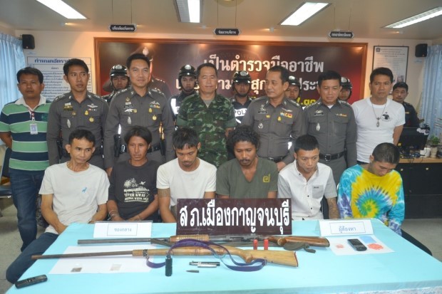 ตร.กาญจน์ฯแถลงผลระดมกวาดล้าง รวบ 6 ผู้ต้องหา พบของกลางปืนปากกาใช้กับกระสุน เอ็ม 16