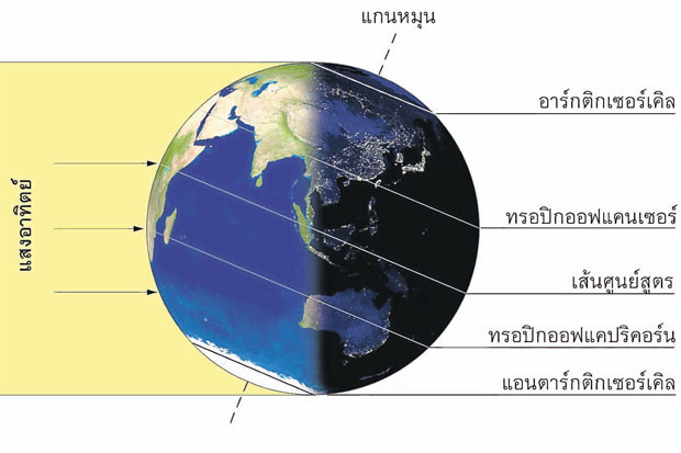 แกนหมุนของโลกเอียงทำมุมกับแนวตั้งฉากกับระนาบวงโคจรรอบดวงอาทิตย์ด้วยมุมประมาณ 23.5 องศา ความเอียงนี้ทำให้เกิดฤดูกาล เมื่อขั้วเหนือหันเข้าหาดวงอาทิตย์ กลางวันยาวนานกว่ากลางคืน แผ่นดินได้รับแสงอาทิตย์เป็นเวลานาน ซีกโลกเหนือจึงเป็นฤดูร้อน และเมื่อขั้วเหนือหันออกจากดวงอาทิตย์ แสงอาทิตย์ทำมุมเฉียงกับพื้นดินมาก กลางคืนยาวนานกว่ากลางวัน ซีกโลกเหนือจึงเป็นฤดูหนาว ส่วนซีกโลกใต้มีฤดูกาลสลับกันกับซีกโลกเหนือ
