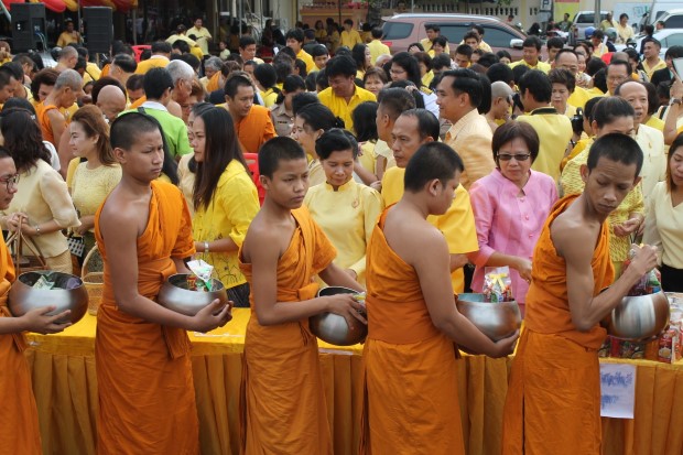 พระนครศรีอยุธยา-พสกนิกรสวมเสือเหลืองตักบาตรพระสงฆ์ขอพรพระพุทธรูปอายุ 690 ปีให้ในหลวงมีพระชนมายุยิ่งยืนนาน