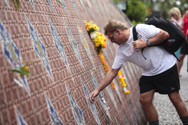 ที่จ.พังงา พ่อผู้เสียชีวิตชาวเยอรมันรายหนึ่งนำแผ่นป้ายรำลึกถึงลูกชายของตนซึ่งเสียชีวิตในเหตุการณ์สึนามิ เมื่อ26 ธันวาคม พ.ศ.2547 มาติดไว้บริเวณอนุสรณ์สถานสึนามิ บ้านน้ำเค็ม