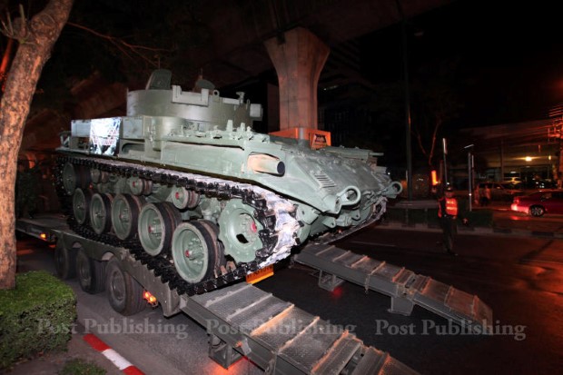 เวลา 19.00-23.00 น. เคลื่อนย้ายยุทโธปกรณ์และเครื่องมือบรรเทาสาธารณภัย อาทิ ยานเกราะล้อยาง, รถถังชนิดต่างๆ, ปืนใหญ่, รถลาดตระเวน (ฮัมวี่), รถกู้ภัย, รถสายพานอเนกประสงค์, รถประปาสนาม จาก จ.ราชบุรี, ปราจีนบุรี , สระบุรี และ กทม. สำหรับเส้นทางการเคลื่อนย้ายจะผ่านเส้นทางสำคัญดังนี้