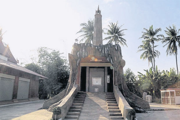 หลังจากเสร็จภารกิจทำบุญก็พาครอบครัวไปนั่งเล่นที่บริเวณวัด แต่ต้องตื่นตาแปลกใจกับอาคารทรงแปลกตารูปร่างลักษณะภายนอก เป็นตอไม้ขนาดใหญ่สีน้ำตาลอมดำตามธรรมชาติของต้นไม้และเปลือกไม้