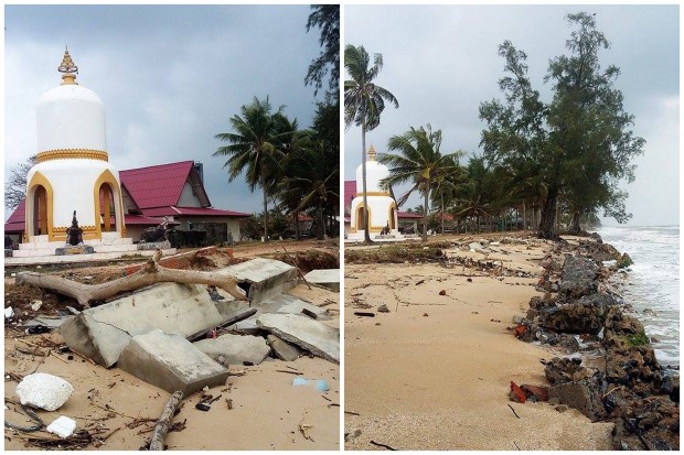 สงขลา-คลื่นทะเลกัดเซาะวัดอู่ตะเภา อ.ระโนด กินพื้นที่เขตวัดกว่า 10 เมตรหวั่นเจดีย์หลวงปู่ทวดพัง
