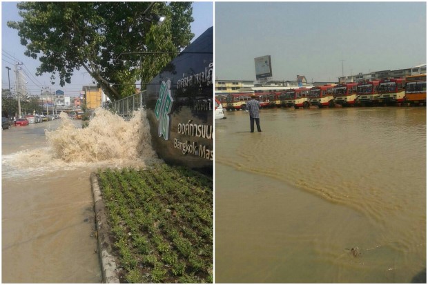 ปทุมธานี-ท่อประปาขนาดใหญ่ย่านรังสิตแตกน้ำทะลักท่วม ถนน โรงแรม อู่รถเมล์ และบ้านเรือนประปาเร่งซ่อม