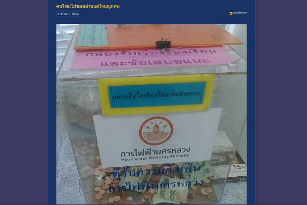 กำลังเป็นกระทู้ที่มีผู้ใช้เครือข่ายสังคมออนไลน์นำไปแชร์ต่อเป็นจำนวนมาก สำหรับกระทู้ในเว็บพันทิปที่ตั้งหัวข้อว่า "คนไทยไม่ชอบอ่านแต่ใจบุญกุศล" ซึ่งตั้งโดยคุณ cybermax ในกระทู้มีภาพของกล่องพลาสติกที่มีข้อความติดไว้ว่า "ตู้รับความคิดเห็นการไฟฟ้านครหลวง" และ "กล่องรับเรื่องร้องเรียนและข้อเสนอแนะ" ทว่าภายในกล่องกลับเต็มไปด้วยเหรียญเงินชนิดต่างๆ และธนบัตร