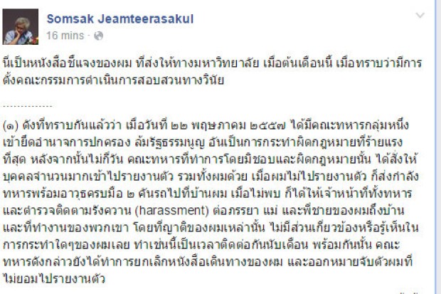 "สมศักดิ์ เจียมธีรสกุล" โพสต์แจงเหตุปฏิบัติราชการไม่ได้ หลังมธ.มีหนังสือไล่ออกจากราชการ