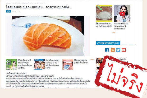 มีการแชร์กันอย่างแพร่หลายถึงข้อความที่อ้างวารสารชื่อ “Ecologist” ระบุว่าไม่ควรกินปลาแซลมอน เพราะมาจากฟาร์มเลี้ยงในยุโรปอันอุดมไปด้วยเชื้อโรค รวมถึงใส่สารเคมีทำให้เกิดโรคมะเร็ง ก่อนจะลงท้ายว่าให้กินปลาทูดีกว่า