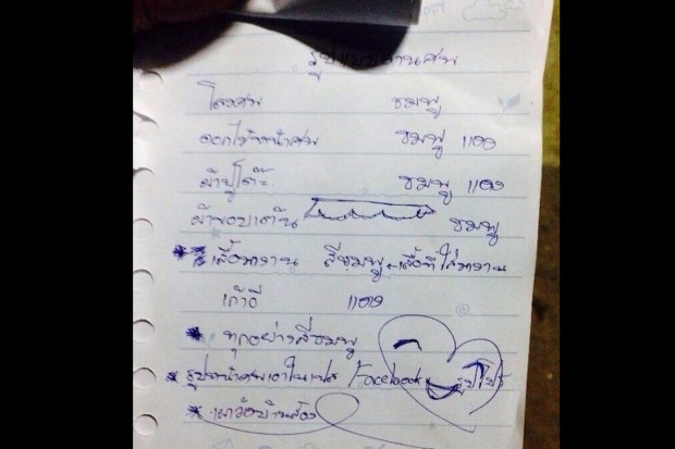 จากการตรวจสอบพบจดหมายลาตายจำนวน 8 แผ่น โดยมีเนื้อหาเขียนถึงเพื่อนและ บุคคลที่รู้จัก รวมทั้งผู้ตายได้เขียนสั่งเสียให้ญาติๆ จัดงานศพโดยใช้โลงศพสีชมพู ดอกไม้สีชมพู-แดง ผ้าปูโต๊ะสีชมพู-แดง ผ้าขอบเต็นท์สีชมพู พร้อมวาดรูปประกอบด้วย เก้าอี้สีแดง คนที่มาในงานศพให้สวมเสื้อผ้าสีชมพู ส่วนรูปหน้าศพอยู่ในเฟซบุ๊ก และให้เผาศพที่วัดบ้านส้อง