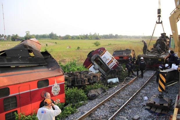 พระนครศรีอยุธยา-เจ้าหน้าที่กู้รถจักรและโบกี้ชนกันที่อำเภอภาษีได้แล้ว กำลังเร่งซ่อมแซมรางเพื่อเปืดให้วิ่งได้ตามปกติ