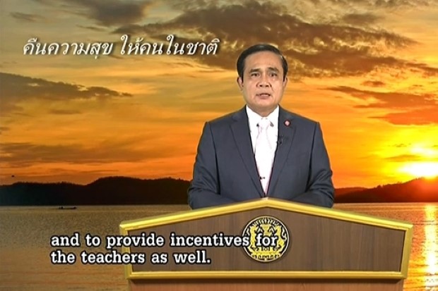 สำหรับเรื่องการศึกษา รัฐบาลให้ความสำคัญเป็นอย่างมาก ผมได้แต่งตั้งคณะกรรมการนโยบายและพัฒนาการศึกษา เพื่อทำหน้าที่เป็นซุปเปอร์บอร์ดด้านการศึกษา ในการร่วมกันหารือและขับเคลื่อนการดำเนินงานด้านการศึกษาของคณะรักษาความสงบแห่งชาติ(คสช.) และรัฐบาล สำหรับการดำเนินงานของคณะกรรมการฯ นี้ มุ่งเน้นใน 3 ภารกิจหลัก คือ 1. การดำเนินงานตามภารกิจประจำ 2. การดำเนินงานตามนโยบายรัฐบาล และ 3. การดำเนินงานสำหรับการวางรากฐานเพื่อส่งต่อไปยังรัฐบาลในอนาคต ทั้งนี้ จะดำเนินการทั้งในด้านการศึกษา การปรับหลักสูตร การพัฒนาคุณภาพครูและผู้เรียน การยกระดับผลสัมฤทธิ์ทางการศึกษา การใช้จ่ายงบประมาณ และการกระจายอำนาจ เน้นให้มีทั้งนักวิชาการและนักปฏิบัติ โดยจะพิจารณานำแนวทางการดำเนินงานจากต่างประเทศมาปรับใช้ ตามความเหมาะสม ซึ่งผมได้มอบหมายให้หน่วยงานและผู้เกี่ยวข้องนำไปพิจารณาดำเนินการ และนำไปเสนอต่อผม ในโอกาสต่อไป ทั้งนี้ เพื่อจะพัฒนาคุณภาพการศึกษาของประเทศที่ตอบสนองต่อความคาดหวังของประชาชนอย่างเป็นรูปธรรม