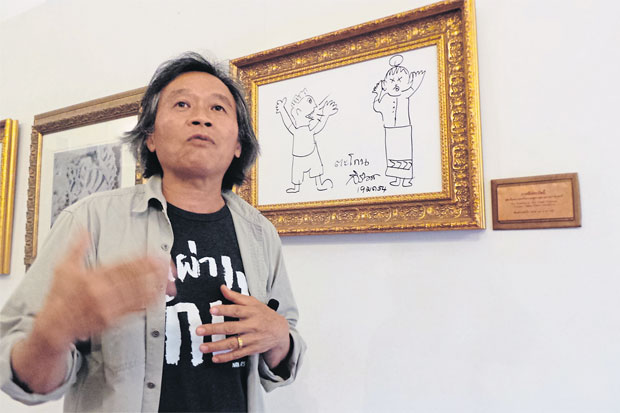 “ทรงมีพระอารมณ์ขันและมีมุมมองที่แตกต่างไปจากศิลปินอื่นๆ โดยทรงมองว่า ภาพปู่ม่านย่าม่าน บนจิตรกรรมฝาผนังของวัดภูมินทร์ มีอายุเก่าแก่ ตรัสทำนองว่า ถึงตอนนี้ปู่ม่านย่าม่านก็อายุมากแล้ว กระซิบคงจะไม่ได้ยิน ต้องตะโกนคุยกันแล้ว ทรงวาดภาพเป็นลายเส้นและกำกับภาพด้วยคำว่า “ตะโกน” พระองค์ตรัสว่า “ภาพนี้ตะโกนนะ เพราะหูตึงกันแล้ว อายุมากแล้ว กระซิบไม่ค่อยรู้เรื่องแล้ว” ทำให้คณะผู้ติดตามต่างพากันหัวเราะ พระองค์ทรงถ่ายทอดออกมาในภาพได้อย่างน่ารัก ในมุมมองที่แตกต่างจากศิลปินต่างๆ และภาพตะโกนก็เปรียบเสมือนภาพอีกหนึ่งสัญลักษณ์ของ จ.น่าน เนื่องจากเป็นภาพวาดฝีพระหัตถ์ที่ทรงวาดที่ จ.น่าน และล้อภาพปู่ม่านย่าม่าน ซึ่งก็ถือเป็นภาพสัญลักษณ์ประจำ จ.น่าน ด้วยเช่นกัน” วินัย บอกเล่าเรื่องราวด้วยสีหน้าที่แสดงออกอย่างเห็นได้ชัดถึงความปลาบปลื้ม พร้อมกับนำชมภาพวาดฝีพระหัตถ์ ที่จัดแสดงไว้ชั้นบนของอาคารแสดงงานศิลป์เพื่อให้ทุกคนได้มีโอกาสชื่นชม
