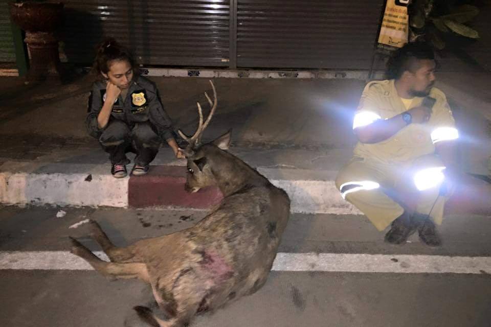 กวางเดินหลุดออกมาจากวัดกิ่งแก้วถูกรถเก๋งชนได้รับบาดเจ็บ เจ้าหน้าที่กู้ภัยช่วยนำส่งคืน