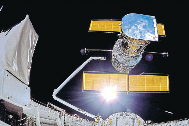 การก่อสร้างกล้องฮับเบิลแล้วเสร็จในปี 2528 และมีกำหนดส่งขึ้นสู่อวกาศในเดือน ต.ค. 2529 การระเบิดของกระสวยอวกาศแชลเลนเจอร์ขณะปล่อยขึ้นจากฐาน ทำให้การส่งกล้องฮับเบิลล่าช้ากว่ากำหนด วันที่ 24 เม.ย. 2533 องค์การนาซาปล่อยกระสวยอวกาศดิสคัฟเวอรีขึ้นสู่อวกาศพร้อมนักบิน 5 คน ในภารกิจนำกล้องโทรทรรศน์อวกาศฮับเบิล ซึ่งมีกระจกรับแสงขนาด 2.4 เมตร ความยาวโฟกัส 57.6 เมตร ไปปล่อยในวงโคจรที่ความสูงจากพื้นโลกราว 600 กิโลเมตร
