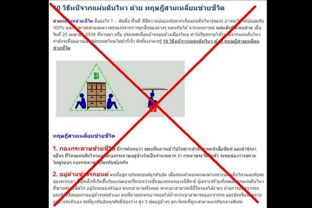 หลังจากที่เครือข่ายสังคมออนไลน์ได้เผยแพร่บทความเกี่ยวกับวิธีเอาตัวรอดจากแผ่นดินไหว เป็นทฤษฎีชื่อว่า "TRIANGLE OF LIFE" หรือ 'สามเหลี่ยมชีวิต' ของ Doug Copp อดีตเจ้าหน้าที่ของหน่วยบรรเทาสาธารณภัยของสหรัฐอเมริกา โดยระบุว่าการขดตัวหลบอยู่ในช่องว่างรูปสามเหลี่ยมด้านข้างของโต๊ะ ตู้ หรือโซฟาขนาดใหญ่ ที่เรียกว่าช่องสามเหลี่ยมชีวิต อาจช่วยให้รอดชีวิตได้