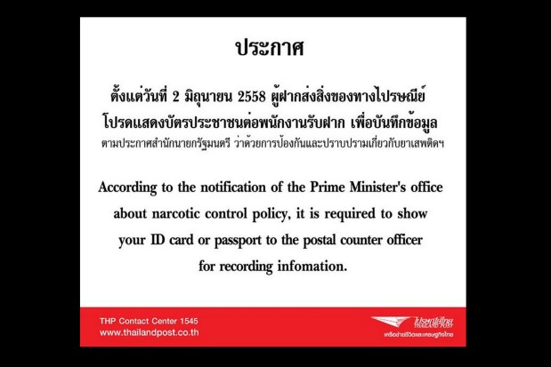อย่างไรก็ตาม บริษัท ไปรษณีย์ไทย จำกัด ขอแจ้งให้ผู้ใช้บริการทราบว่ายาเสพติดเป็นสิ่งของผิดกฎหมาย และต้องห้ามในการขนส่งทางไปรษณีย์โดยเด็ดขาด สิ่งของที่เกี่ยวข้องอาจใช้เป็นพยานหลักฐานในการดำเนินคดีตามกฎหมายได้.