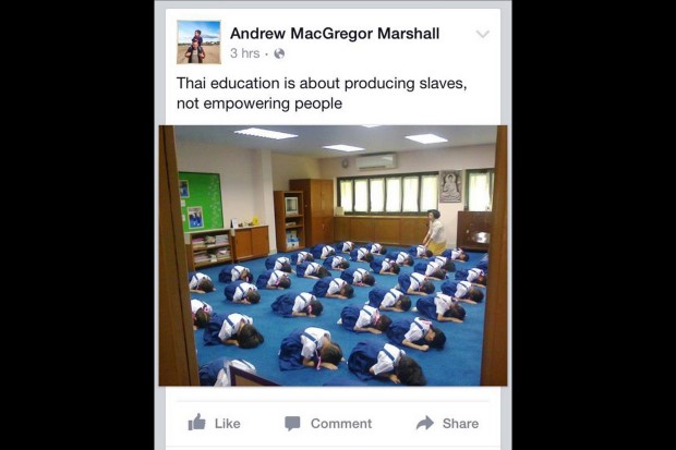 เมื่อวันที่ 7 มิ.ย. เครือข่ายสังคมออนไลน์ได้วิพากษ์วิจารณ์กันอย่างกว้างขวาง กรณีที่นายแอนดรูว์ แม็คเกรเกอร์ มาร์แชลล์อดีตผู้สื่อข่าวรอยเตอร์ประจำเอเชียและตะวันออกกลาง ได้โพสต์เฟซบุ๊ก Andrew MacGregor Marshall เป็นภาพเด็กนักเรียนไทยกำลังคุกเข่ากราบในท่าเบญจางคประดิษฐ์ พร้อมระบุข้อความว่า “Thai education is about producing slaves, not empowering people (การศึกษาไทยคือการผลิตทาส มิใช่การสร้างคน)”