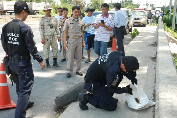 สระบุรี-ตำรวจอีโอดีเก็บกู้ระเบิดใส่ถุงปุ๋ยทิ้งไว้ขอบสะพานเป็นระเบิดเก่าแต่สภาพยังพร้อมใช้งาน