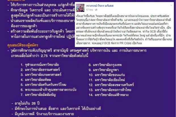 หลังจากกรณีที่สมาชิกผู้ใช้ทวิตเตอร์ชื่อ"@LadyGunga"ได้โพสต์ภาพประกาศรับสมัครงานของธนาคารไทยพาณิชย์ในตำแหน่งที่ปรึกษาทางการเงินฝึกหัด (Financial Advisor Trainee) โดยระบุคุณสมบัติว่าเกรดเฉลี่ยไม่ต่ำกว่า 2.75 จากมหาวิทยาลัยเฉพาะ 14 สถาบัน ได้แก่ จุฬาลงกรณ์มหาวิทยาลัย ธรรมศาสตร์ เกษตรศาสตร์ มหิดล ศรีนครินทรวิโรฒ พระจอมเกล้าเจ้าคุณทหารลาดกระบัง อัสสัมชัญ กรุงเทพ บูรพา ขอนแก่น เชียงใหม่ สงขลานครินทร์ หอการค้าไทย แม่ฟ้าหลวง ก่อให้เกิดกระแสวิพากษ์วิจารณ์อย่างมากว่าเป็นการเลือกปฏิบัติหรือไม่