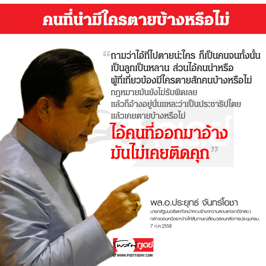 "ถามว่าไอ้ที่ไปตายน่ะใคร ก็เป็นคนจนทั้งนั้น เป็นลูกเป็นหลาน ส่วนไอ้คนนำหรือผู้ที่เกี่ยวข้องมีใครตายสักคนบ้างหรือไม่ กฎหมายมันยังไม่รับผิดเลย แล้วก็อ้างอยู่นั่นแหละว่าเป็นประชาธิปไตย แล้วเคยตายบ้างหรือไม่ ไอ้คนที่ออกมาอ้าง มันไม่เคยติดคุก"