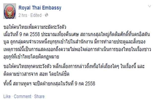 เฟซบุ๊ก Royal Thai Embassy แจ้งเตือน ข้อความว่า ขอให้คนไทยเพิ่มความระมัดระวังตัว เมื่อวันที่ 9 กค 2558 ประมาณเที่ยงคืนเศษ(ตามเวลาตุรกี) สถานกงสุลใหญ่กิตติมศักดิ์ที่นครอิสตันบูล ถูกกลุ่มคนจำนวนหนึ่งบุกรุกเข้าไปในสำนักงาน มีการทำลายประตูและสิ่งของ เหตุการณ์นี้เป็นการแสดงออกถึงความไม่พอใจต่อการดำเนินการของไทยในเรื่องชาวอุยกูร์ที่เข้าไทยโดยผิดกฏหมาย