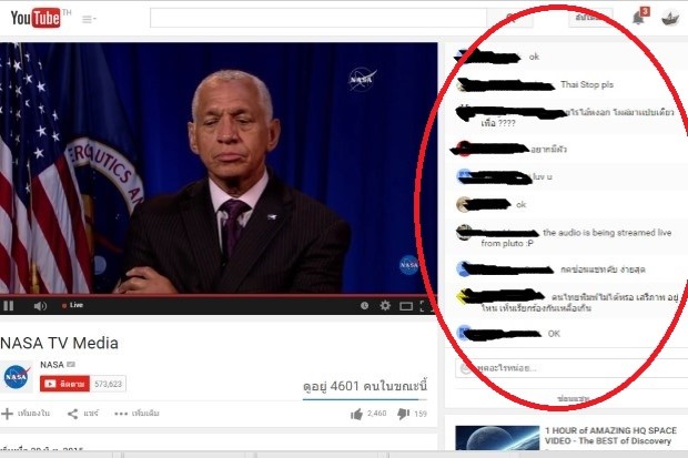 แต่ปรากฏว่า มีผู้ใช้อินเทอร์เน็ตชาวไทยจำนวนมากเเห่เข้าไปกระหน่ำพิมพ์ข้อความภาษาไทยจนสร้างความวุ่นวายในช่องถ่ายทอดสดดังกล่าว ด้วยถ้อยคำที่ไม่มีสาระ หยาบคาย ตลกกันเอง ไม่เกี่ยวข้องใดๆ กับดาราศาสตร์ ซึ่งนั่นทำให้ข้อความของผู้ที่สนใจในภารกิจดาวพลูโตถูกเบียดให้ตกไป จนบรรดาผู้บริหารที่เตรียมตอบคำถามให้กับชาวโลกถึงกับอึ้ง
