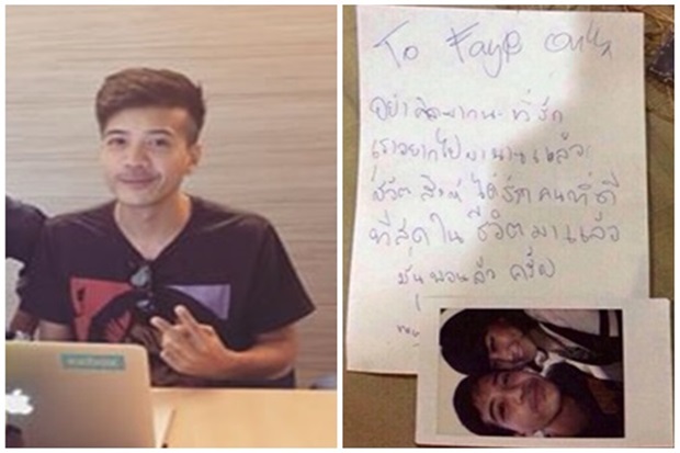 ขณะที่ โลกออนไลน์ได้มีการแชร์จดหมายที่อ้างว่า เป็นข้อความสุดท้ายจาก หนุ่ม"สิงห์ ประชาธิป" พร้อมรูปคู่แฟนสาว ก่อนที่จะเกิดเหตุการณ์ตกลงมาจากชั้น 9 คอนโดมิเนียม โดยข้อความในจดหมายระบุว่า "To Faye only อย่าคิดมากนะที่รัก เราอยากไปมานานแล้ว ชีวิตสิงห์ได้รักคนที่ดี ที่สุดในชีวิตมาแล้ว มันพอแล้วครับ"