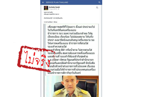 จากกรณีที่มีการเผยแพร่ภาพพร้อมข้อความในสังคมออนไลน์ โดยอ้างว่า ม.ล.ปนัดดา ดิศกุล รมต.ประจำสำนักนายกรัฐมนตรี ได้ส่งหนังสือเวียนถึงหัวหน้าส่วนราชการทั่วประเทศว่า ขอความร่วมมือให้ข้าราชการสุภาพสตรีแต่งกายให้สุภาพ รวบผมให้เรียบร้อย ไม่ให้แต่งหน้า ฯลฯ นั้น