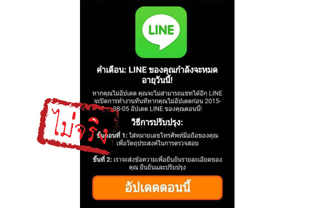 หลังจากมีข้อความส่งต่อโดยเตือนว่า ไลน์ของคุณกำลังจะหมดอายุวันนี้ หากไม่อัพเดทจะไม่สามารถแชตได้อีก พร้อมให้ผู้ใช้ใส่หมายเลขโทรศัพท์เพื่อให้ตรวจสอบนั้น ได้รับการยืนยันจาก วารดี วสวานนท์ หัวหน้าฝ่ายประชาสัมพันธ์ LINE Thailand ว่าไม่เป็นความจริง ผู้ใช้อย่าเผลอกดเข้าไปตามคำหลอกลวงของแฮ็กเกอร์