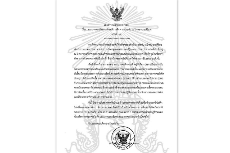 ตามที่พระบาทสมเด็จพระเจ้าอยู่หัวได้เสด็จพระราชดำเนินมาประทับ ณ โรงพยาบาลศิริราช เพื่อรับการตรวจและรักษา ตามคำกราบบังคมทูลของคณะแพทย์ผู้ถวายการรักษา ในระหว่างที่ประทับอยู่ ณ โรงพยาบาลศิริราช พระบาทสมเด็จพระเจ้าอยู่หัวมีพระเสมหะ และมีพระปรอท (ไข้) ต่ำๆเป็นครั้งคราว อัตราการเต้นของพระหทัยเป็นปรกติ ซึ่งสำนักพระราชวังได้แถลงให้ทราบมาเป็นระยะๆแล้วนั้น