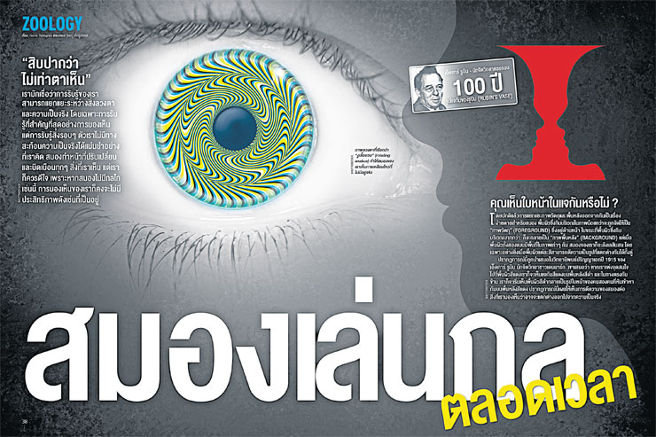 กว่า 100 ปีมาแล้วที่นักวิทยาศาสตร์ใช้ภาพลวงตาอย่าง “แจกันของรูบิน” เพื่อศึกษาการทำงานของสมอง ในปัจจุบันเมื่อนักวิทยาศาสตร์ประยุกต์เทคโนโลยีสมัยใหม่เข้ามาก็สามารถทำให้พวกเราเข้าใจการทำงานของภาพลวงตา เช่น ภาพ “งูเลื้อยวน” (หน้า 34) ได้ชัดเจนขึ้น