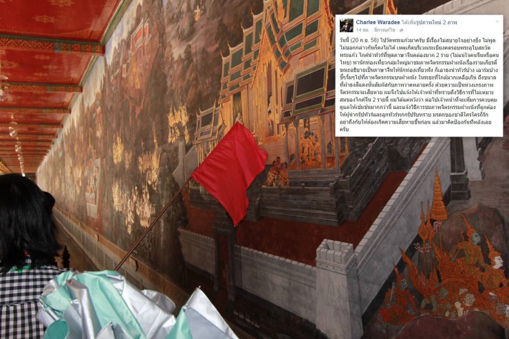 "วันนี้ (20 ก.ย. 58) ไปวัดพระแก้วมาครับ มีเรื่องไม่สบายใจอย่างยิ่ง ไม่พูดไม่บอกกล่าวกันก็คงไม่ได้ เหตุเกิดบริเวณระเบียงคดรอบพระอุโบสถวัดพระแก้ว ไกด์นำทัวร์ที่พูดภาษาจีนคล่องมาก 2 ราย (ไม่แน่ใจคนจีนหรือคนไทย) พานักท่องเที่ยวกลุ่มใหญ่มาชมภาพจิตรกรรมฝาผนังเรื่องรามเกียรติ์ ขณะอธิบายเป็นภาษาจีนให้นักท่องเที่ยวฟัง ก็เอาธงนำทัวร์บ้าง เอาร่มบ้าง ชี้ๆจิ้มๆไปที่ภาพจิตรกรรมบนฝาผนัง ในระยะที่ใกล้มากเหลือเกิน ถึงขนาดที่ผ้าธงสีแดงนั้นสัมผัสกับภาพวาดหลายครั้ง ด้วยความเป็นห่วงเกรงภาพจิตรกรรมจะเสียหาย ผมจึงไปแจ้งให้เจ้าหน้าที่ทราบถึงวิธีการที่ไม่เหมาะสมของไกด์จีน 2 รายนี้ ผมได้แต่หวังว่า ต่อไปเจ้าหน้าที่จะเพิ่มการควบคุมดูแลให้เข้มข้นมากกว่านี้ และแจ้งวิธีการชมภาพจิตรกรรมฝาผนังที่ถูกต้องให้ผู้นำกรุ๊ปทัวร์และลูกทัวร์ทุกกรุ๊ปรับทราบ มรดกของชาติใครใครก็รัก อย่าถึงกับให้ต้องเกิดความเสียหายขึ้นก่อน แล้วมาคิดป้องกันทีหลังเลยครับ"