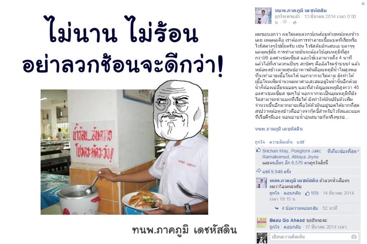 "ผมขอบอกว่า ผมไม่เคยลวกช้อนส้อมด้วยหม้อหุงข้าวเลย เหตุผลคือ เราต้องการทำลายเชื้อแบคทีเรียหรือไวรัสต่างๆใช่มั้ยครับ เช่น ไวรัสตับอักเสบเอ บลาๆๆ แต่คุณรู้มั้ย การทำลายมันจะต้องใช้อุณหภูมิที่สูงกว่า98 องศาเซลเซียส และใช้เวลานานถึง 4 นาที แล้วไอ้ที่เราลวกแป๊บๆ สะบัดๆ คืออัลไรคร้าบบบ! แล้วหม้อหุงข้าวตามศูนย์อาหารมันมีอุณหภูมิน้ำไม่สูงพอ ที่จะทำลายเชื้อโรคได้ นอกจากจะไม่ตาย ยังทำให้เชื้อโรคเพิ่มจำนวนมหาศาลสะสมอยู่ในน้ำนั้นอีกด้วย น้ำก็ต้องเปลี่ยนบ่อยๆ และที่สำคัญอุณหภูมิสูงกว่า 45 องศาเซลเซียส จุ่มๆไป นอกจากจะเป็นอุณหภูมิที่ยังไม่สามารถฆ่าแบคทีเรียได้ ยังทำให้มันปรับตัวเพิ่มจำนวนขึ้นอีกมากมายเพื่อให้ตัวมันอยู่รอดได้มากที่สุด สรุปว่าหม้อหุงข้าวคืออ่างจากุ๊ดชี่สำหรับไวรัสและแบคทีเรียดีๆนี่เอง นอนอาบน้ำอุ่นสบายกันจริงๆเรย..."