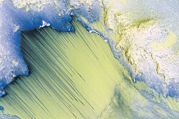 ภาพถ่ายความละเอียดสูงของพื้นผิวดาวอังคารจากยานมาร์สรีคอนเนสเซนส์ออร์บิเตอร์แสดงให้เห็นว่ามีโครงสร้างแนวเส้นมืดคล้ำหลายเส้นอยู่ตามพื้นที่ลาดชัน โดยเฉพาะอย่างยิ่งตามผนังด้านในของหลุมอุกกาบาต ร่องรอยเหล่านี้ก่อตัวยาวหลายเมตรในช่วงปลายฤดูใบไม้ผลิถึงต้นฤดูร้อน เมื่ออุณหภูมิประมาณ 250-300 เคลวิน แล้วจางลงเมื่ออุณหภูมิต่ำลง ก่อนจะกลับมาใหม่เมื่ออากาศอุ่นขึ้นในปีถัดไป แสดงว่ามีกระบวนการบางอย่างที่ทำให้โครงสร้างนี้เกิดซ้ำเป็นวัฏจักร ซึ่งดูคล้ายการไหลของของเหลวบางอย่างจากที่สูงลงสู่ที่ต่ำ